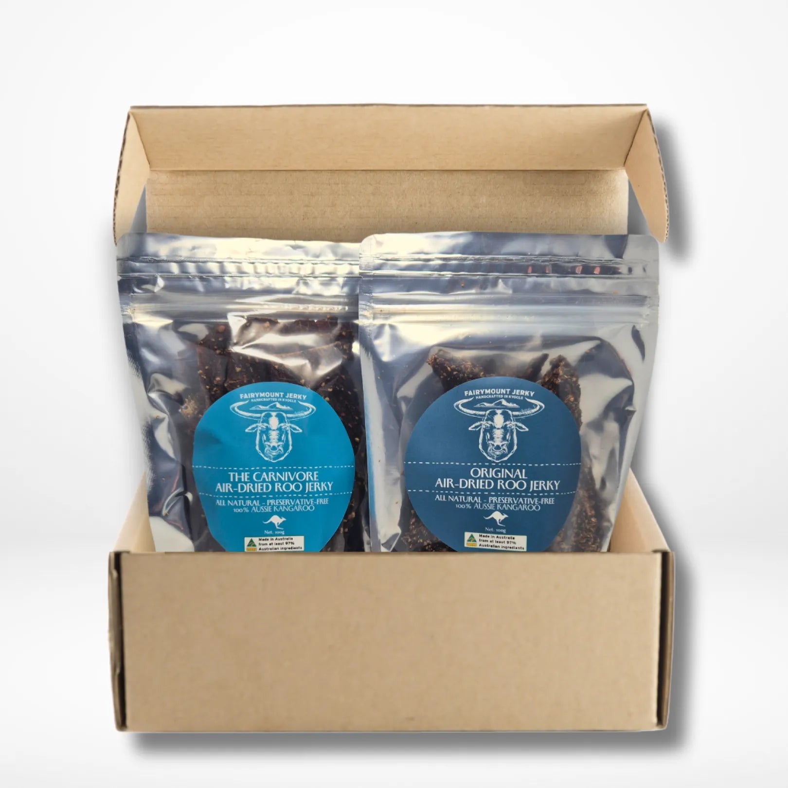 Discover the Roo Box, a true Aussie adventure in every bite! Packed with both of our Kangaroo flavours - original OG Roo Jerky and Carnivore Roo Jerky. This box brings the wild flavours of the outback straight to your taste buds.